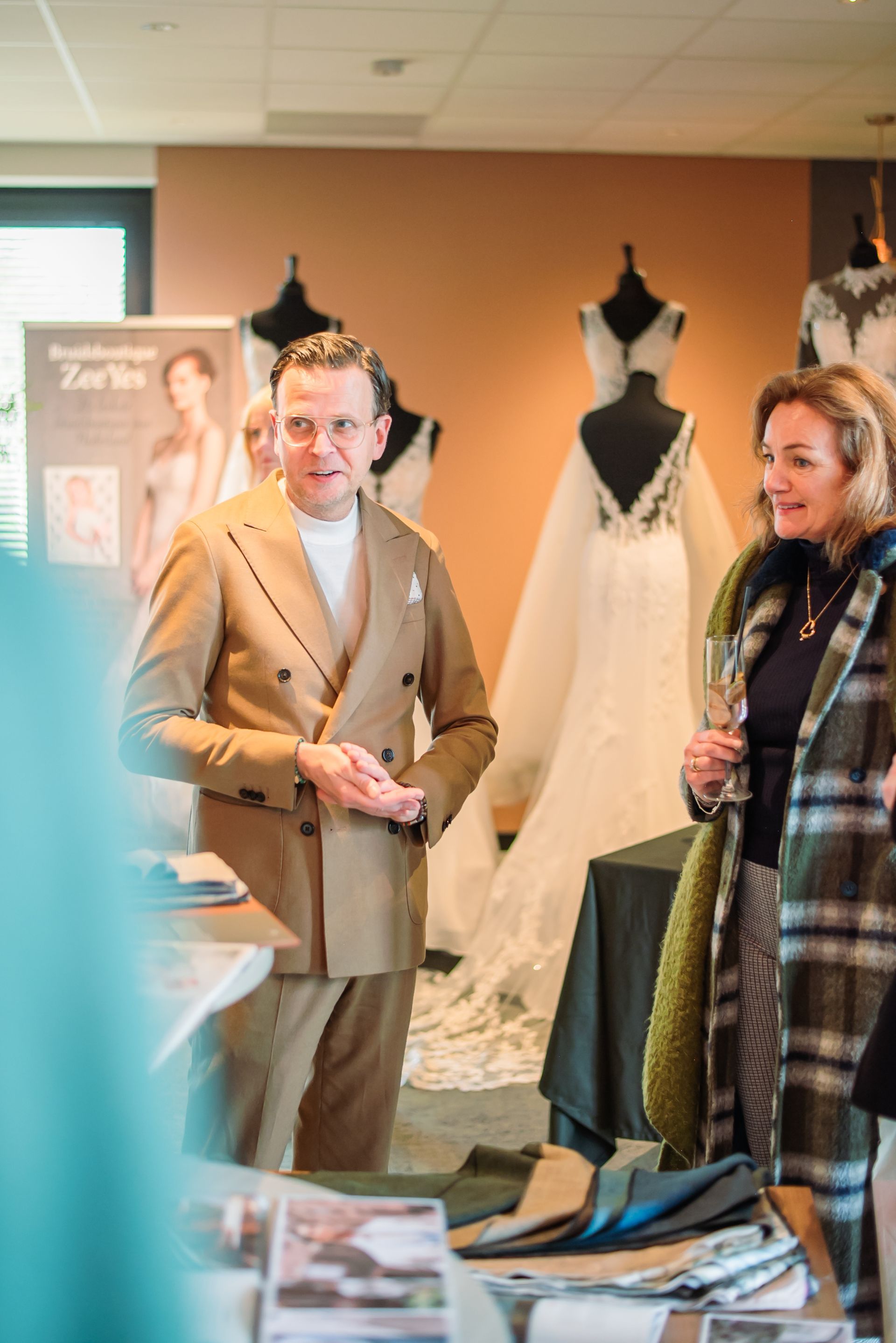 Vanaf 11:00 uur stroomden de gasten binnen, waarbij ze meteen werden ondergedompeld in een feestelijke sfeer. De dag begon met een inspirerende entree, waar bezoekers volop ideeën konden opdoen voor een spectaculaire ontvangst van hun eigen gasten. In het ‘bruidsmodebos’ presenteerden Bruidsboutique Zee Yes en Misura Sartoria een schitterende collectie trouwjurken en maatpakken, waardoor velen hun droomoutfit al voor zich zagen.